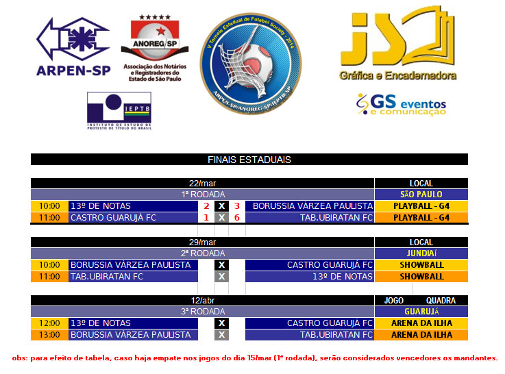 Aproveitamos para esclarecer alguns pontos do regulamento: No torneio feminino, a equipe AS CARTORETES, por ter melhor campanha na fase inicial, leva a vantagem do empate na decisão. Não haverá prorrogação ou disputa de pênaltis. Vitória por qualquer placar dá o título ao vencedor. Nas finais masculinas da Grande São Paulo (3º lugar e decisão), em caso de empate, haverá disputa de pênaltis para se conhecer o vencedor. Não haverá vantagem de empate para qualquer equipe. Nos torneios masculinos, a premiação de artilheiro e goleiro menos vazado só será entregue na FASE ESTADUAL, sendo válidos apenas os gols marcados nesta fase. A Fase Estadual será disputada no mês de janeiro de 2015, em formato de quadrangular. ![]() MASCULINO GRANDE SÃO PAULO ![]() ![]() MASCULINO INTERIOR