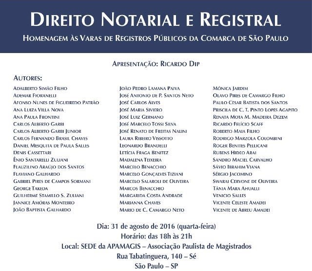 No próximo dia 31 de agosto (quarta-feira), na sede da Associação Paulista de Magistrados (Apamagis) será lançada a obra “Direito Notarial e Registral - Homenagem às Varas de Registros Públicos da Comarca de São Paulo”, coordenada pelos juízes Marcelo Benacchio, titular da 2ª Vara de Registros Públicos de SP, Tânia Mara Ahualli, titular da 1ª Vara de Registros Públicos da Capital.