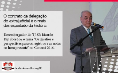 Durante todo seu discurso, o desembargador deixou evidente sua preocupação com o futuro da atividade, principalmente com o que nomeou como “registrão”. “Me aflige o fato de ver que a proposta do registro único pode tornar o cartório de Registro Civil apenas um guichê de coleta e repasse de dados, algo que, além de descaracterizar o trabalho do registrador civil, ainda cria um poder sem precedentes às instituições financeiras”, disse. ![]() Dip também deixou registrada sua insatisfação sobre a política de gratuidade nos atos de Registro Civil. “Volto a repetir aqui o que disse no congresso que participei em São Paulo recentemente (clique aqui e veja), e que muitos dos senhores estavam presentes, que a gratuidade está asfixiando o Registro Civil. E ainda digo mais: o trabalho que vocês fazem é um dos mais importantes da sociedade, e merece ser devidamente pago, por isso digo com todas as letras que os senhores não merecem esmolas. Se o Estado quer a gratuidade nos serviços, que pague pelas despesas e não jogue nas costas de vocês”, desabafou. ![]() Segundo o desembargador, “o contrato de delegação do extrajudicial é o mais desrespeitado da história. A política da gratuidade está asfixiando o registro civil das pessoas naturais”, disse o Dip. “Se o Estado acha que deve agraciar o usuário do serviço com a gratuidade, ele que arque com isso”, afirmou. Para o desembargador alguns posicionamentos do Judiciário, e certas atitudes dos registradores ajudam a enfraquecer o sistema. “Outro aspecto preocupante é a necessidade de se criar provimento para tudo. Os registradores não praticam nada se não estiverem embasados em provimentos”, declarou o desembargador. Para Dip o momento é de caos em relação aos registros, às notas e ao Poder Judiciário. “Hoje o Judiciário dá ao extrajudicial as suas funções para se desafogar, mas juntamente dá a gratuidade. Os senhores não devem se acomodar a estes casos”, disse. O desembargador ainda falou sobre a tendência da responsabilidade objetiva conferida aos Oficiais (saiba mais clicando aqui). “A responsabilidade objetiva nada mais é do que um trabalho de desconstrução do Registro Civil, que tem muito mais cunho político do que qualquer outra coisa. E isso é culpa em grande parte do Poder Judiciário”. Sua participação foi finalizada reforçando que é necessário que os “registradores civis se unam para tentar se fazer ouvir contra os atrasos que estão sendo propostos”, encerrou. Para o desembargador o Registro Civil corre sério risco de perder seu objetivo original, pois a busca do interesse individual ultrapassou o interesse coletivo. “O direito à felicidade individual justifica o acesso a qualquer coisa do Registro Civil e isso é preocupante. Eu, João, posso chegar hoje ao cartório e dizer que me sinto Maria. Amanhã poderei chegar aos 70 anos e ir ao cartório dizer que me sinto com 40. O Registro Civil está virando uma espécie de álbum de recordações”, disse o desembargador. “Neste mecanismo hiperindividualista a minha intenção prevalece sobre o social. Na hora em que tudo puder ser feito no RCPN, pra que existir registro civil?”, completou Dip. | ||