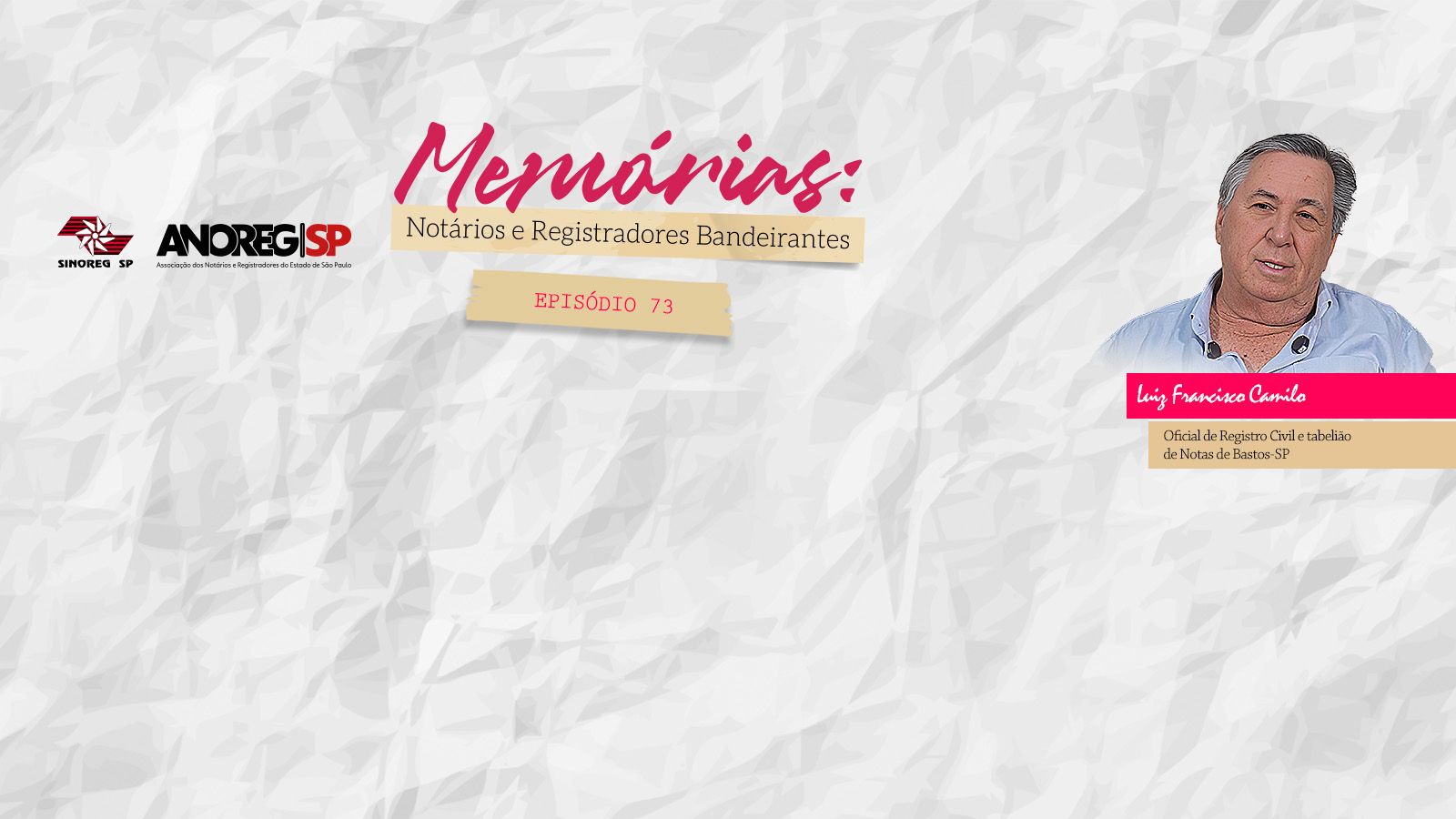 ![]() O Oficial de Registro Civil e tabelião de Notas de Bastos-SP, Luiz Francisco Camilo, é o septuagésimo terceiro entrevistado do projeto “Memórias: Notários e Registradores Bandeirantes”, promovido pela Associação dos Notários e Registradores do Estado de São Paulo (Anoreg/SP) e pelo Sindicato dos Notários e Registradores do Estado de São Paulo (Sinoreg/SP).